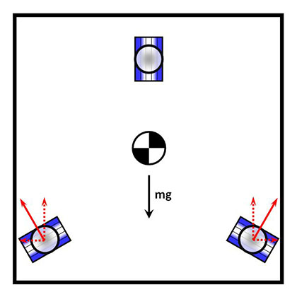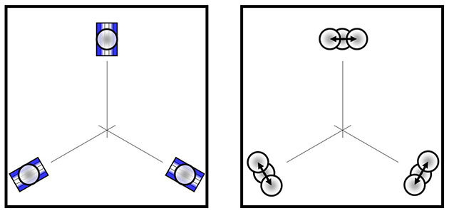 As a matter of fact, all kinematic mount elements generally communicate through in-plane stresses. Take for example the classic 3-groove mount, when used in a vertical (wall-mounted) orientation (shown on the right). Clearly, the vertically-oriented groove cannot take vertical forces, and the two slanted grooves create normal forces that have perpendicular components (horizontal dashed arrows) that put the mated component in tension - and so also create the same type of in-plane stresses.